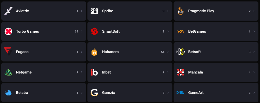 3oaks; Pragmatic Play; Playson; Champion; Pateplay; Nolimit City; Booming Games; Habanero; Skywind; Fugaso; Spinomenal; SmartSoft; Belatra.