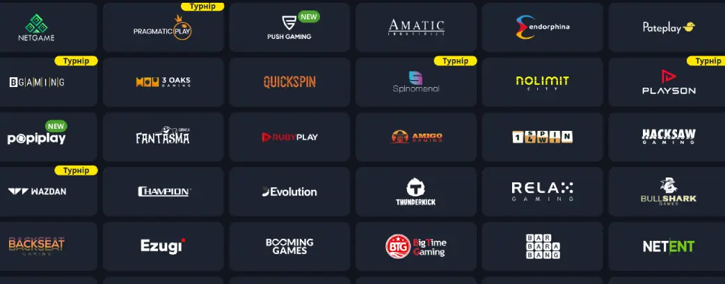 NetEnt; Novomatic; Nolimit City; Microgaming; Blueprint Gaming; Evolution Gaming; Pragmatic Play; Yggdrasil Gaming; Thunderkick; Red Tiger Gaming.