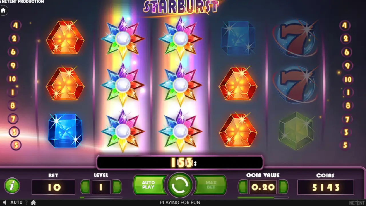 Технічні характеристики слота чіпляють гравців: мінімальна ставка починається від 0,10 монет, максимальна досягає 100 монет, а максимальний виграш може скласти до 50 000 монет. Starburst слот має низьку волатильність, що гарантує часті виграші, і високий RTP на рівні 96,09%.